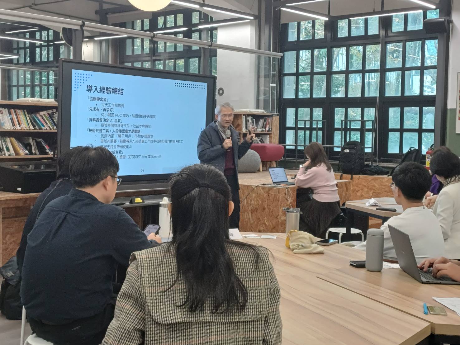 In the subsequent session, Professor San-Yi Huang, also serving as a project principal investigator, further elaborated on “Trends in Generative AI Technologies and Industry–Academia Collaboration Experiences.” Through real-world cases, he demonstrated the application outcomes of generative AI, text mining, and knowledge management systems in industry, enabling participants to better understand feasible pathways for AI deployment. The session continued with presentations by Dr. Pei-Chi Lo, Co-Principal Investigator, who shared intelligent marketing solution planning based on large language model (LLM) agents; Mr. Yi-Hang Tsai, Ph.D. candidate, who introduced an LLM-agent-based knowledge management system and a knowledge graph collaboration case with ASE Technology; and Mr. Chia-Ming Chang, Ph.D. candidate, who presented practical industry–academia projects including an AI-enabled cloud platform for the restaurant industry with Jihe Information and a RAG-based enterprise intelligent dialogue system developed with Yulon Nissan.